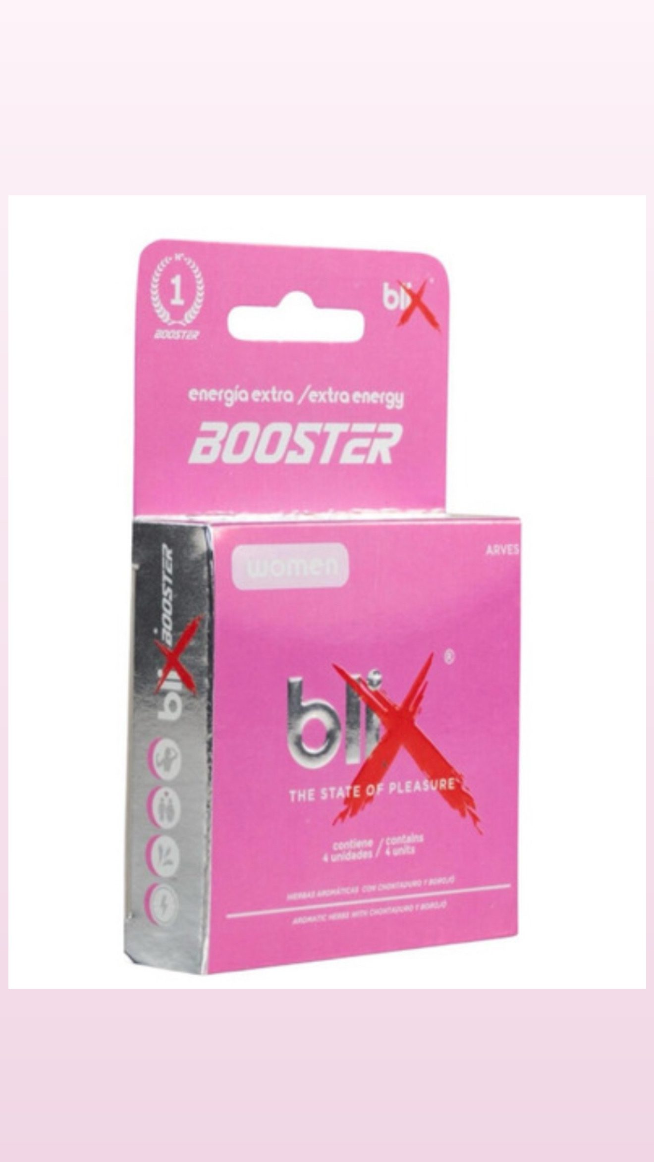Con tan solo 1 tableta de Blix booster for women 30 minutos antes de cualquier relación o actividad física demandante, reducirá el estrés, mejorando así el estado de animo, aumentando los niveles hormonales y energía necesaria para vivir en su máximo potencial.