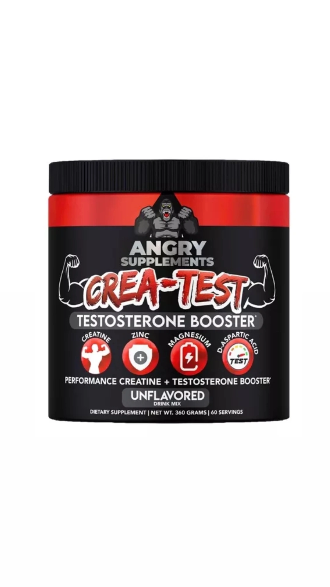 - Aumento de la prueba 2 en 1 + suplemento de creatina: ¿Por qué comprar un refuerzo de testosterona y creatina en suplementos separados que pierden tanto tiempo como dinero, cuando puedes combinar los poderes de ambos en Angry Supplements CREA-TEST! Nuestro polvo de rendimiento premium contiene 100% creatina monohidrato 200 malla, ácido D-aspártico, zinc y magnesio. CREA-TEST es sin sabor, de alta calidad y fácil de usar